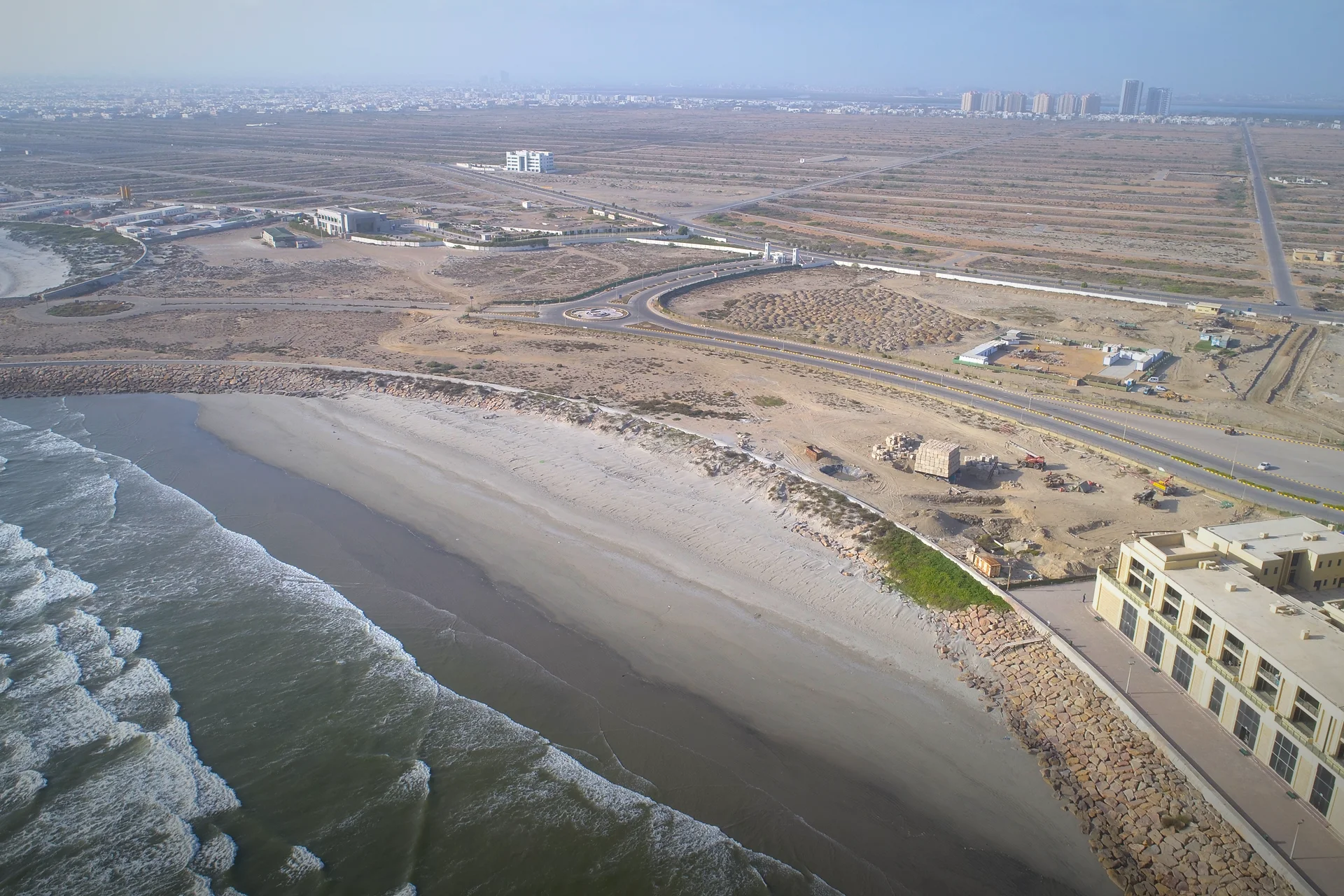 Installing comprehensive utility networks (Sewerage, MV Feeder, Fire, Water) for Emaar Oceanfront Phase 2A infrastructure in Karachi.