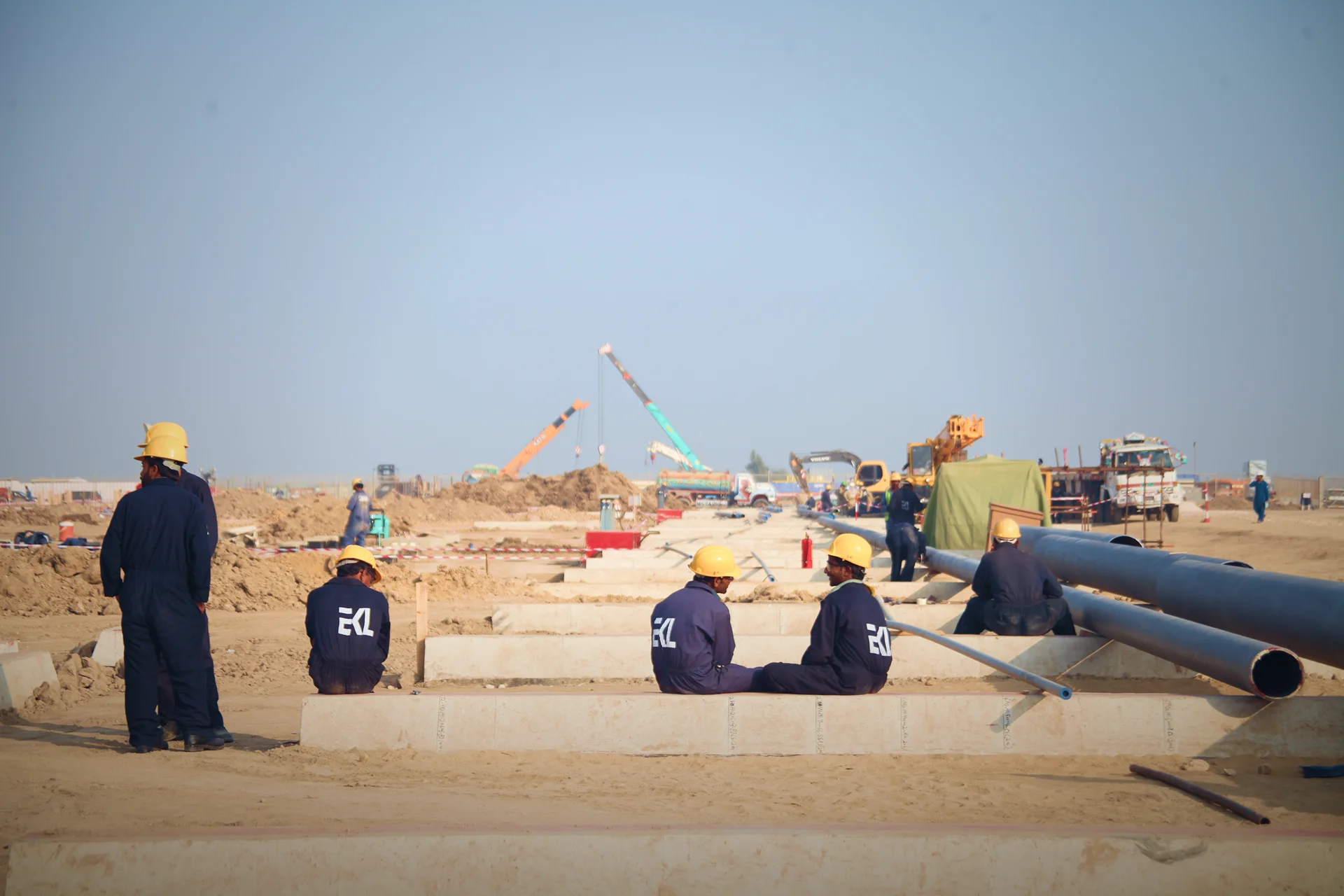 Installing comprehensive utility networks (Sewerage, MV Feeder, Fire, Water) for Emaar Oceanfront Phase 2A infrastructure in Karachi.